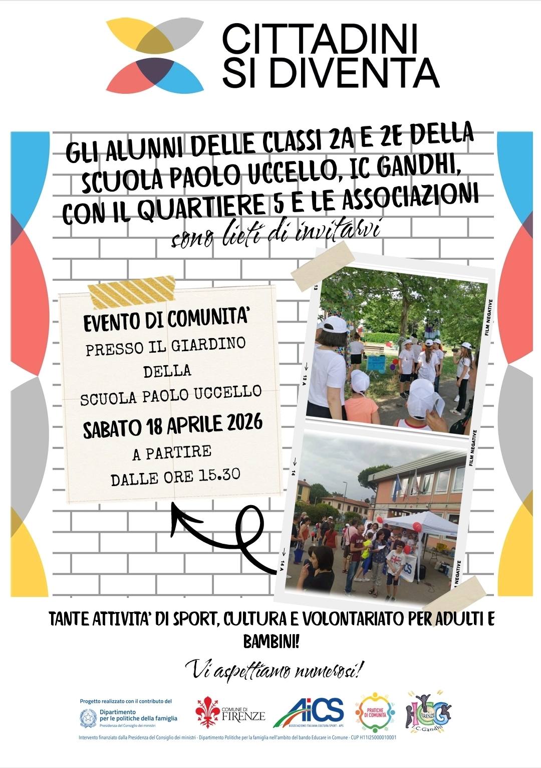 Un pomeriggio di partecipazione, creatività e impegno civico per trasformare la scuola in uno spazio sempre più vissuto, condiviso e aperto alla comunità. È in programma venerdì 18 aprile, nel cortile della scuola secondaria di primo grado Paolo Uccello di Firenze, uno degli appuntamenti più significativi del progetto “Cittadini si diventa”, promosso da AiCS all’interno di “Pratiche di comunità”, coordinato dal Comune di Firenze e finanziato dal Dipartimento per le politiche della famiglia nell’ambito del bando Educare. Il progetto coinvolge le classi 2A e 2E dell’Istituto comprensivo Gandhi in un percorso che mette insieme sport, cultura, volontariato, educazione civica e valorizzazione degli spazi comuni.